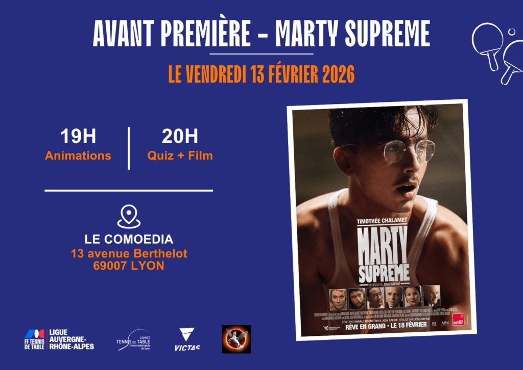 En partenariat avec la Ligue et le Comité, le Comoedia (cinéma à Lyon) propose en avant première le film Marty Supreme le vendredi 13 février.