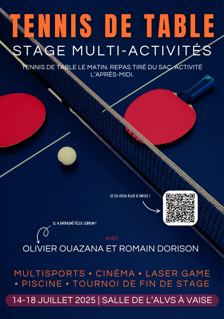 Stage de Tennis de Table et Multi-Activités Du lundi 14 au vendredi 18 juillet 2025…