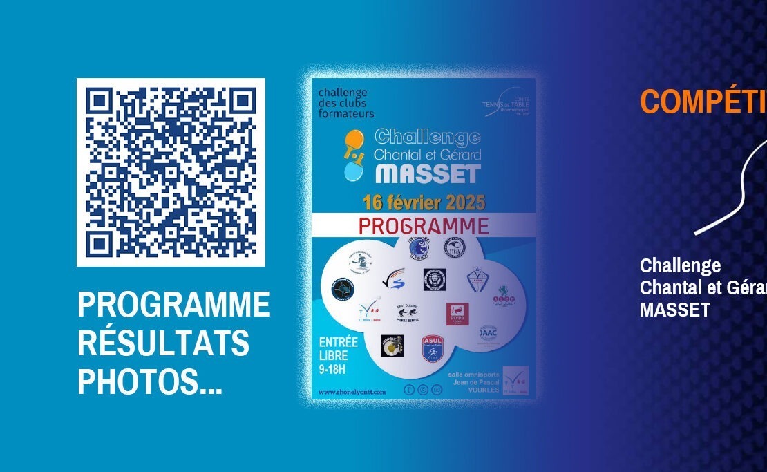 Le Challenge Masset se déroule ce dimanche 16 février 2025 à la salle omnisports Jean de Pascal de Vourles, en co-organisation avec le TT Rhône-Garon.