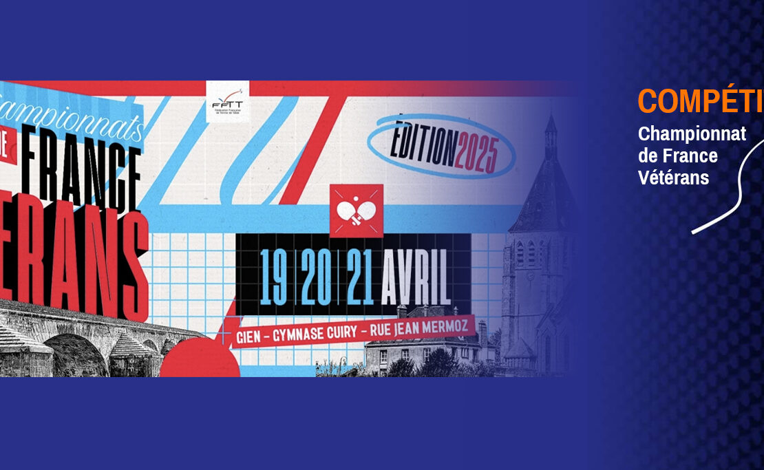 Pas moins de 29 titres étaient en jeu lors des Championnats de France Vétérans organisés par le club de Gien. Lors de cette édition, Claire Clavier et Mohamed Sofiane Boudjadja ont notamment été sacrés en simple dans la catégorie vétérans 40. Applaudissons Ginette Brambilla, de l’ES Jonage, qui atteind les 1/2 finales en Simples Dames V80, obtient l’argent en Doubles Dames V80 avec sa partenaire Francine Beauduceau (Atlantique TT 17), puis l’or en Doubles Mixtes V80 avec son coéquipier Alain Flageul (TT La Baie Yffiniac).