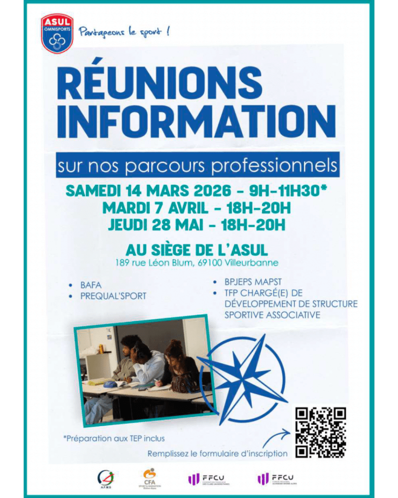 L’ASUL omnisports organise un temps d’information dédié aux formations aux métiers du sport et de l’animation, ouvert à toute personne souhaitant s’informer, s’orienter ou construire un projet professionnel dans ces domaines.