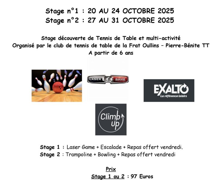 Stage de tennis de table aux vacances de la Toussaint / Frat Oullins – Pierre-Bénite TT