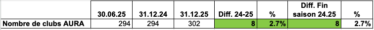Évolution en AURA (nombre de clubs, licences féminines, -19 & +19)